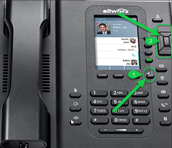 2. On your Allworx 9312 phone, press the button pictured above (1) and then select “Settings”.