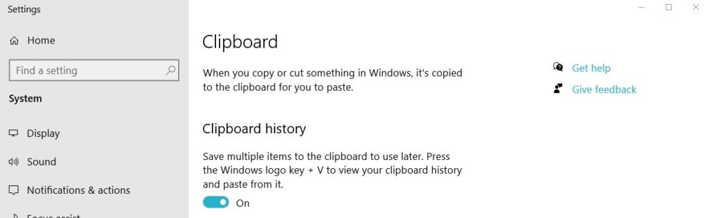 To turn on this setting, simply navigate to your settings -> system -> clipboard and turn on “Clipboard history”. After this is enabled, you will be able to use the command “Windows logo key + V” to view the history of what you had copied.