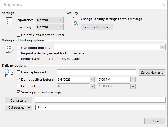 2.Under Delivery options, select the Do not deliver before check box, and then click the delivery date and time you want. Please note that the message will send to the recipient, until a minute after the time you have it set to deliver at. Make sure that the “Save copy of sent message” is selected, to ensure that you have a record of that sent email saved in your “sent” folder.